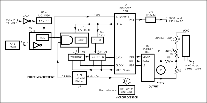 Bertrand Zauhar did another GPSDO design around the same time as James Miller. He used a PIC microcontroller as the central element and does almost everything in software. This simplifies the hardware quite a bit: Beside the PIC and the output divider and drivers, there is only a signal conditioner at the input and an opamp to build a PWM based ADC. Unfortunately, the design is built around an FLL (frequency locked loop), which induces a slight frequency error. In principle it should be possible to do a PLL as well to get rid of this frequency error. I have not checked the details of the design, so I cannot say why Bertrand choose to do an FLL design instead of a PLL design. Maybe it is a limitation of the PIC.